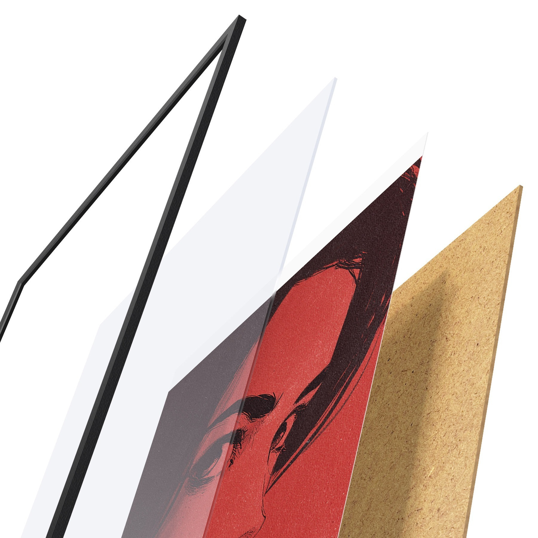 El póster consta de marco, plexiglás, imagen impresa y soporte de aglomerado. El póster puede colgarse inmediatamente en la pared gracias a los soportes de la parte posterior.