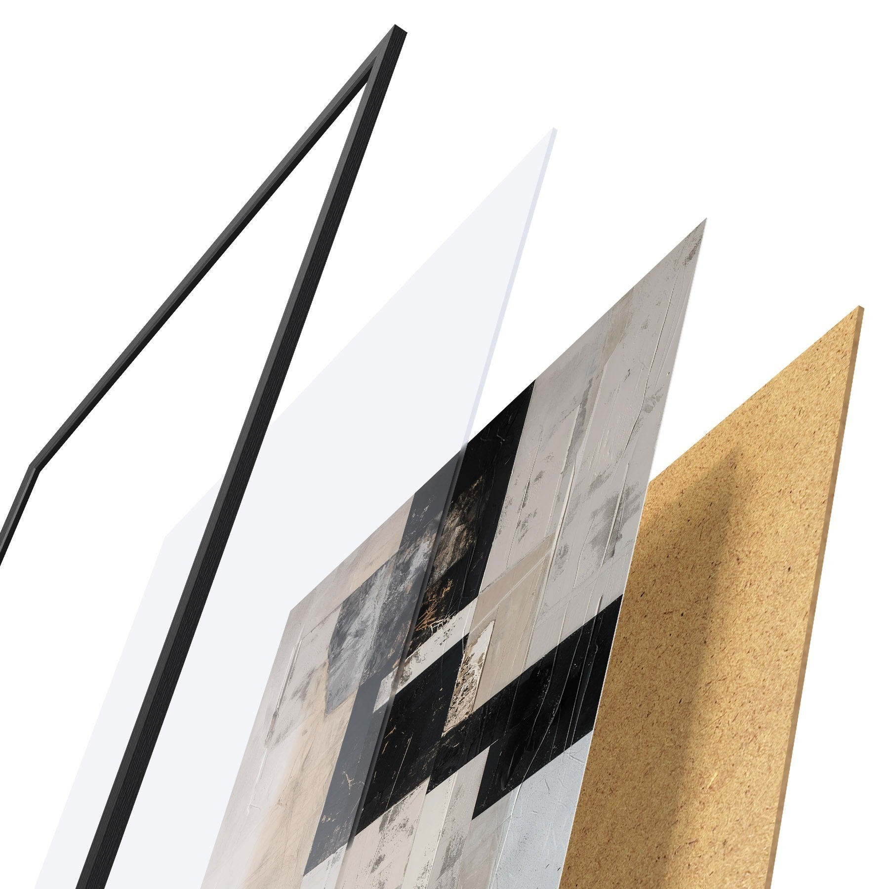 El póster consta de marco, plexiglás, imagen impresa y soporte de aglomerado. El póster puede colgarse inmediatamente en la pared gracias a los soportes de la parte posterior.