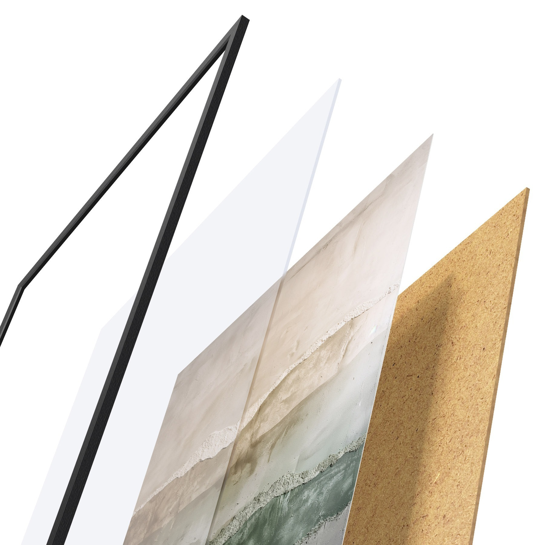 El póster consta de marco, plexiglás, imagen impresa y soporte de aglomerado. El póster puede colgarse inmediatamente en la pared gracias a los soportes de la parte posterior.
