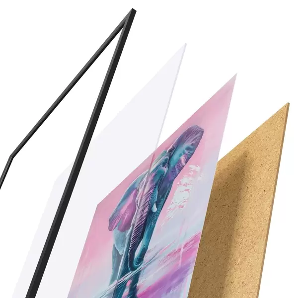 El póster consta de marco, plexiglás, imagen impresa y soporte de aglomerado. El póster puede colgarse inmediatamente en la pared gracias a los soportes de la parte posterior.