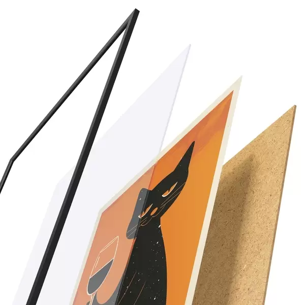 El póster consta de marco, plexiglás, imagen impresa y soporte de aglomerado. El póster puede colgarse inmediatamente en la pared gracias a los soportes de la parte posterior.
