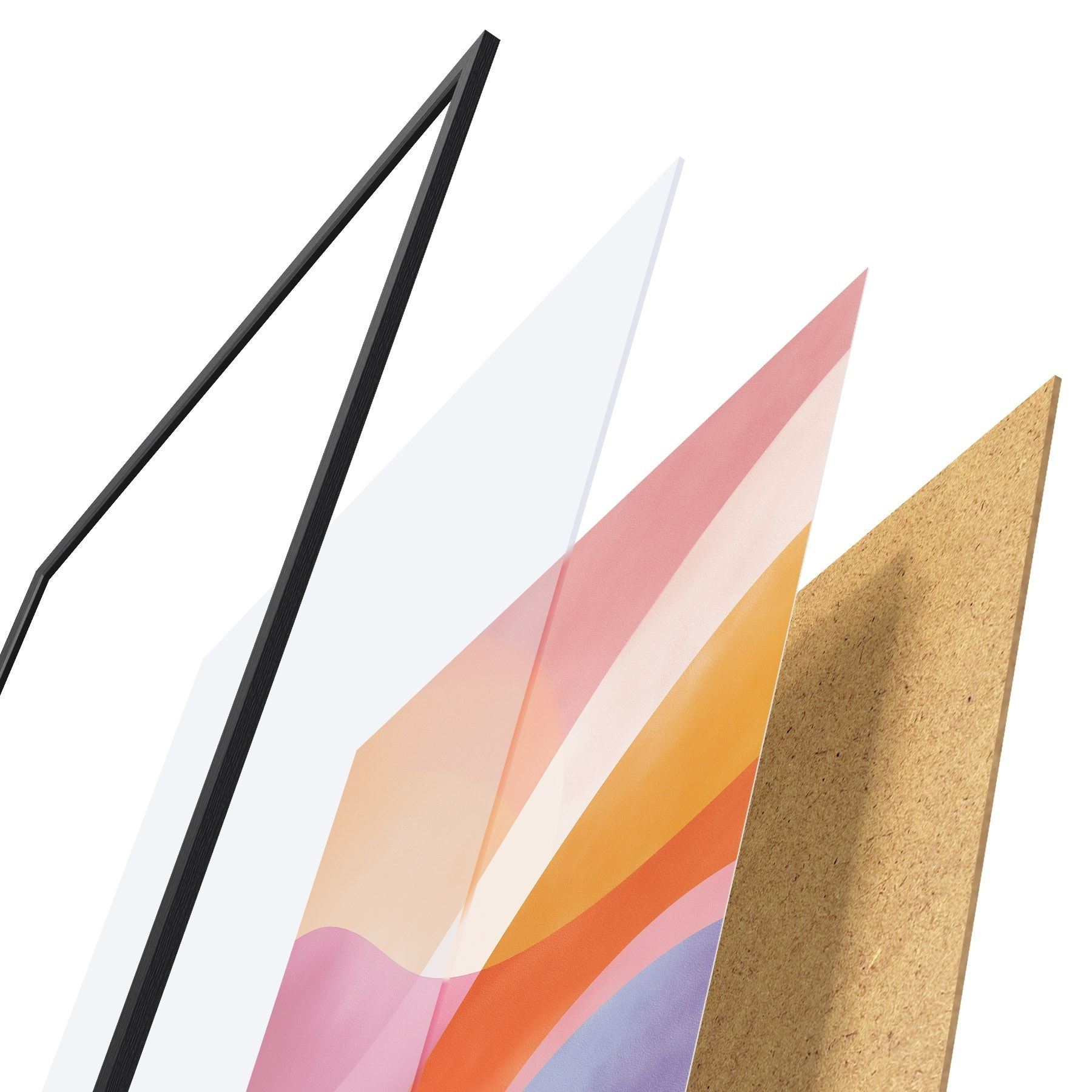 El póster consta de marco, plexiglás, imagen impresa y soporte de aglomerado. El póster puede colgarse inmediatamente en la pared gracias a los soportes de la parte posterior.