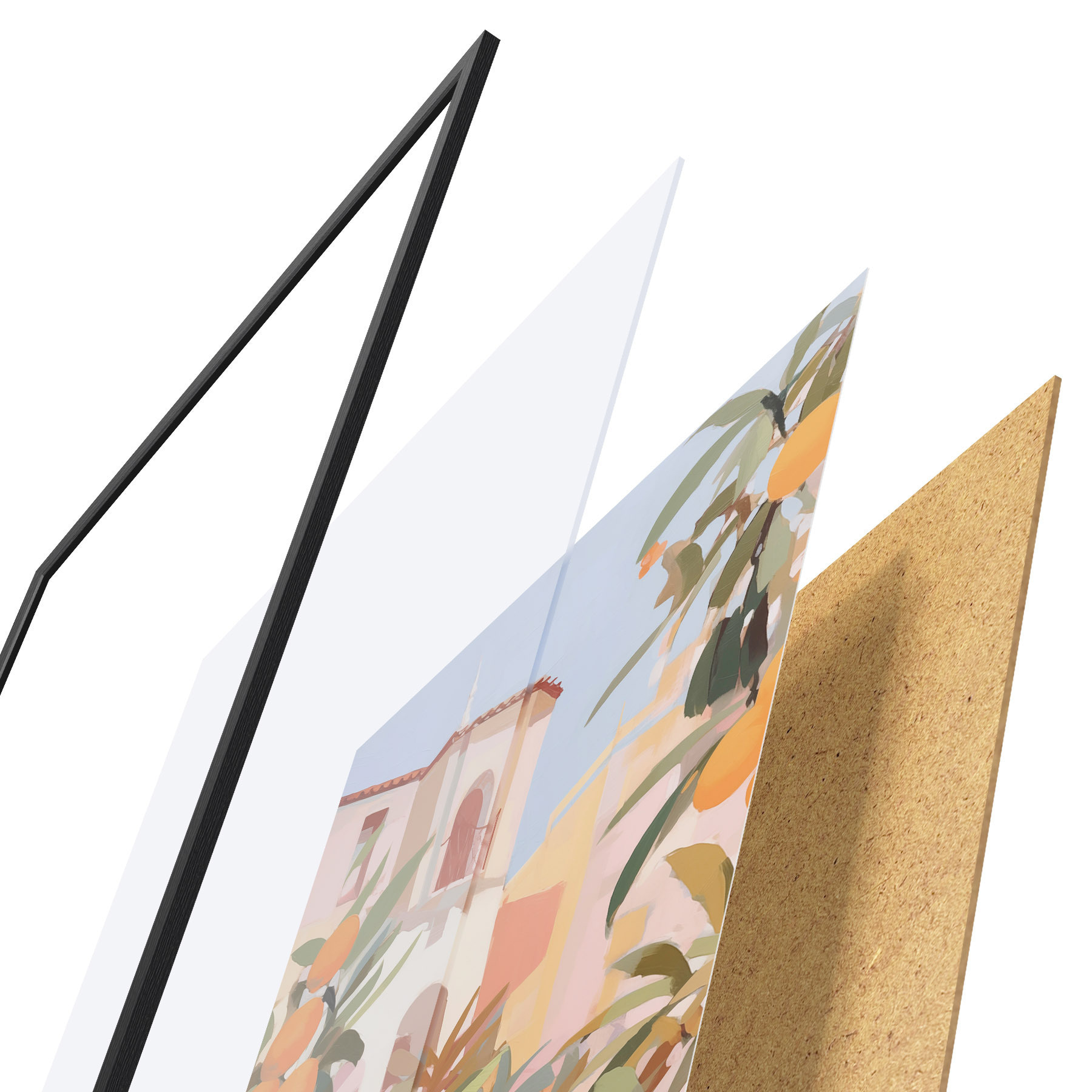 El póster consta de marco, plexiglás, imagen impresa y soporte de aglomerado. El póster puede colgarse inmediatamente en la pared gracias a los soportes de la parte posterior.