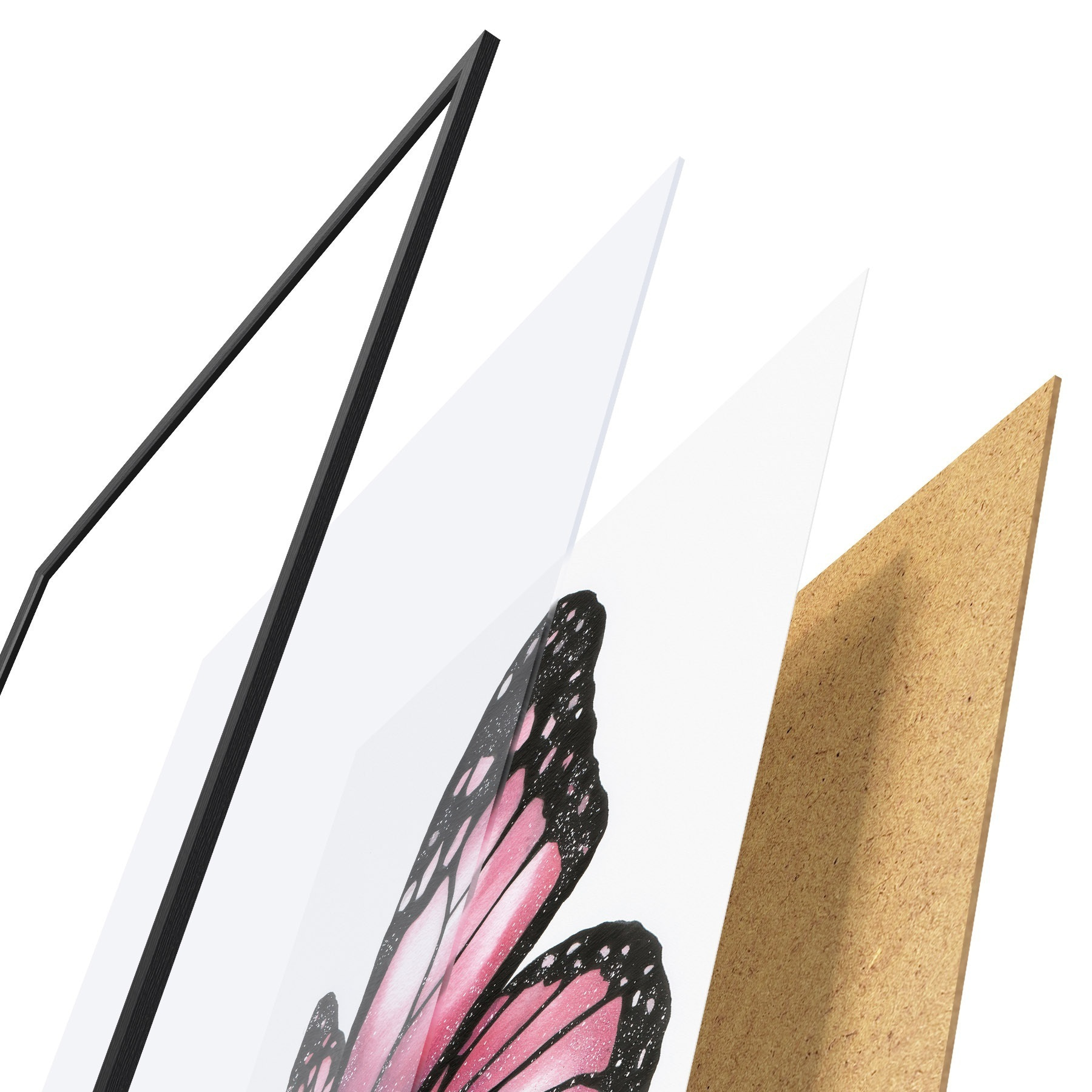 El póster consta de marco, plexiglás, imagen impresa y soporte de aglomerado. El póster puede colgarse inmediatamente en la pared gracias a los soportes de la parte posterior.