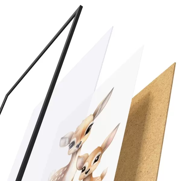 El póster consta de marco, plexiglás, imagen impresa y soporte de aglomerado. El póster puede colgarse inmediatamente en la pared gracias a los soportes de la parte posterior.