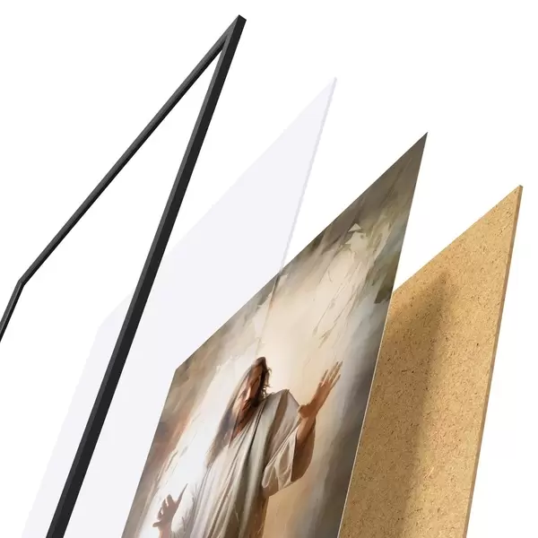 El póster consta de marco, plexiglás, imagen impresa y soporte de aglomerado. El póster puede colgarse inmediatamente en la pared gracias a los soportes de la parte posterior.