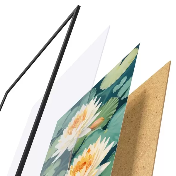 El póster consta de marco, plexiglás, imagen impresa y soporte de aglomerado. El póster puede colgarse inmediatamente en la pared gracias a los soportes de la parte posterior.
