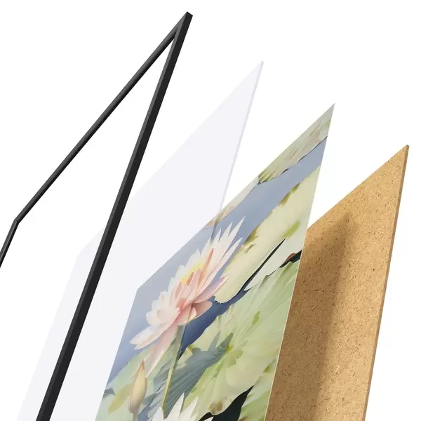 El póster consta de marco, plexiglás, imagen impresa y soporte de aglomerado. El póster puede colgarse inmediatamente en la pared gracias a los soportes de la parte posterior.