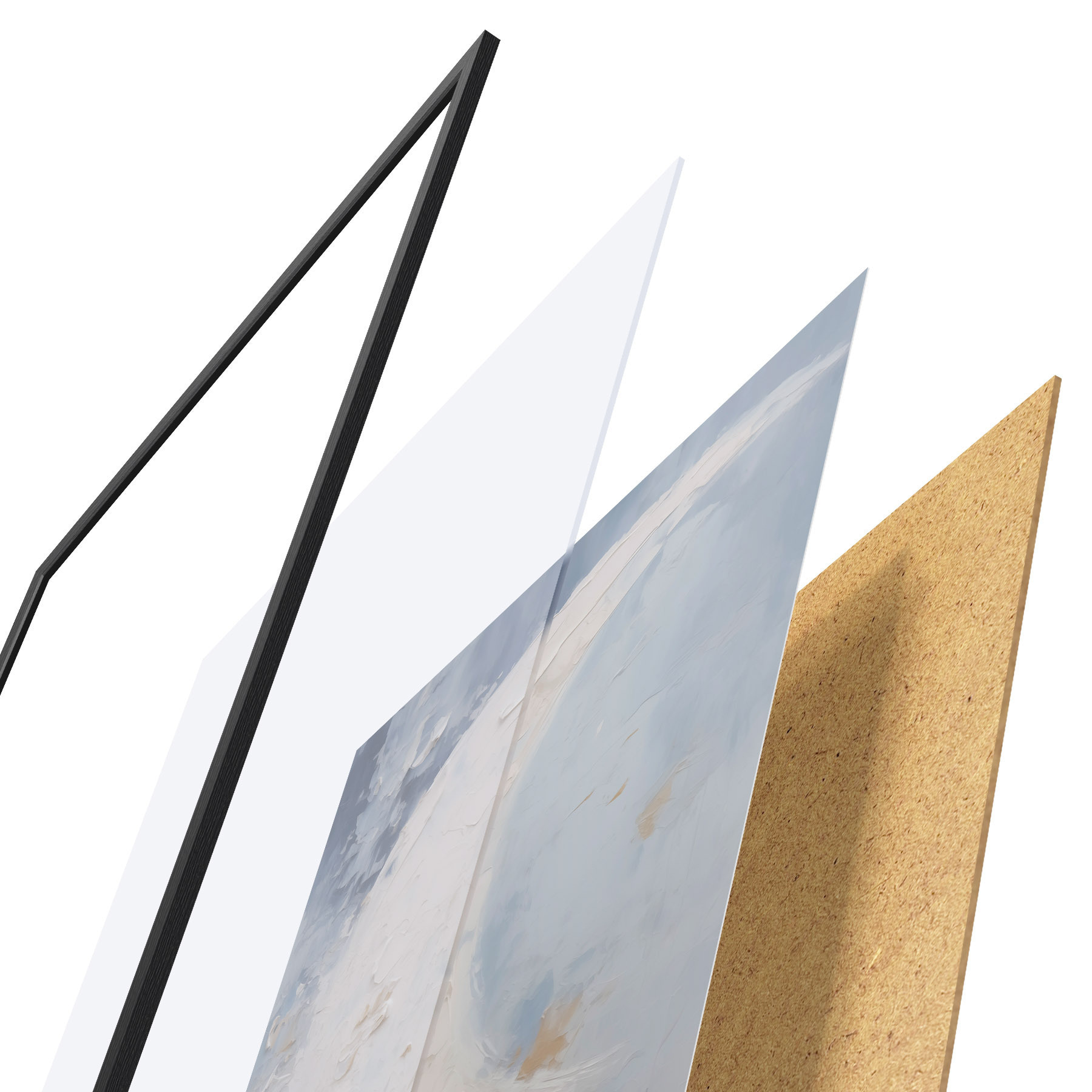 El póster consta de marco, plexiglás, imagen impresa y soporte de aglomerado. El póster puede colgarse inmediatamente en la pared gracias a los soportes de la parte posterior.