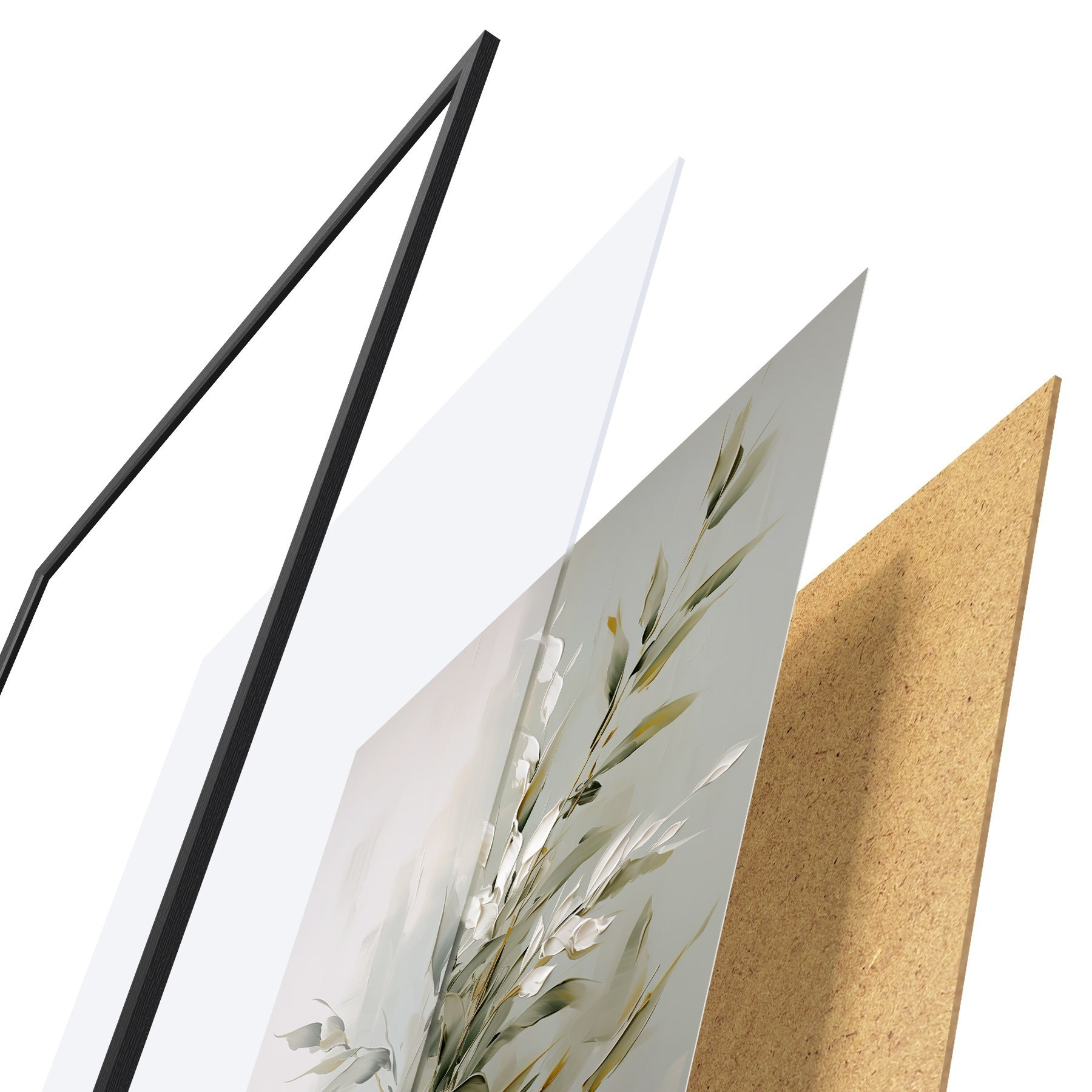 El póster consta de marco, plexiglás, imagen impresa y soporte de aglomerado. El póster puede colgarse inmediatamente en la pared gracias a los soportes de la parte posterior.