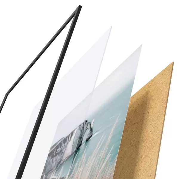 El póster consta de marco, plexiglás, imagen impresa y soporte de aglomerado. El póster puede colgarse inmediatamente en la pared gracias a los soportes de la parte posterior.