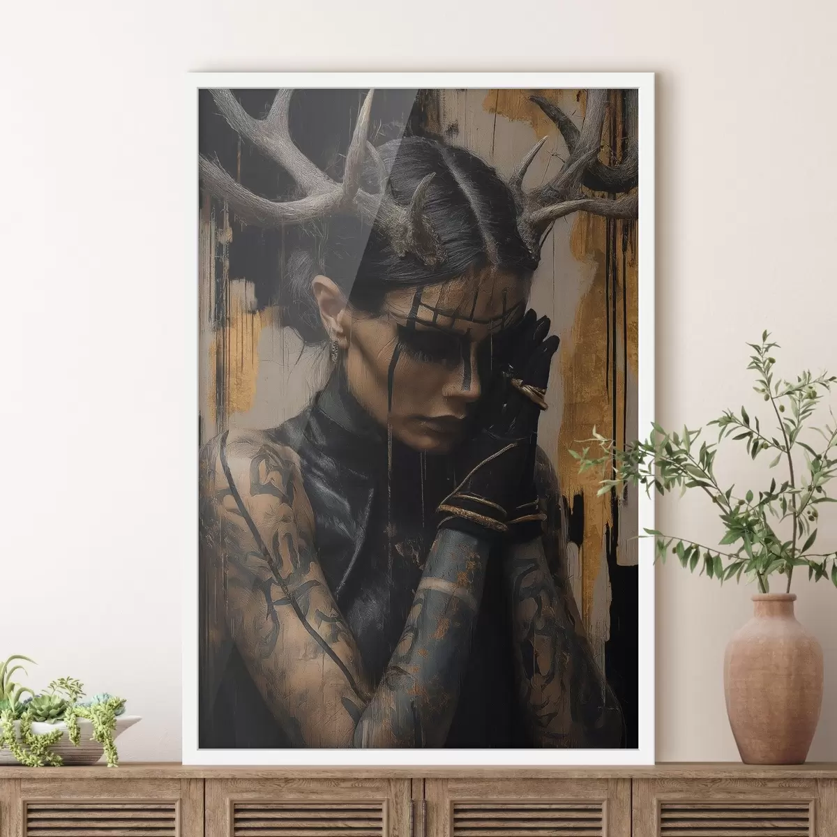Poster Mujer con cuernos y aspecto sombrío, con líneas faciales negras f46144