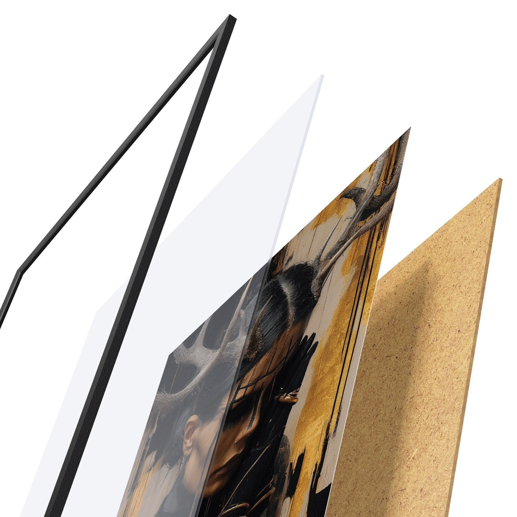 El póster consta de marco, plexiglás, imagen impresa y soporte de aglomerado. El póster puede colgarse inmediatamente en la pared gracias a los soportes de la parte posterior.