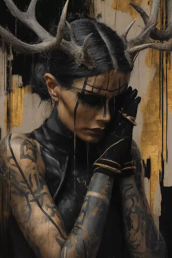 Poster Mujer con cuernos y aspecto sombrío, con líneas faciales negras f46144
