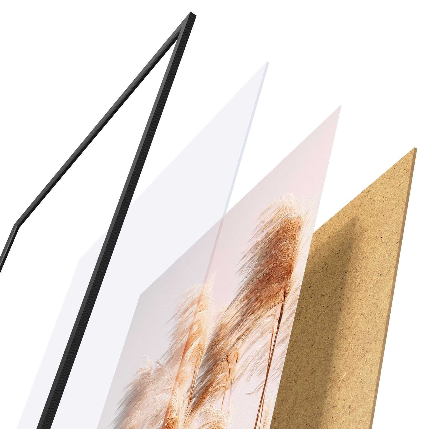 El póster consta de marco, plexiglás, imagen impresa y soporte de aglomerado. El póster puede colgarse inmediatamente en la pared gracias a los soportes de la parte posterior.