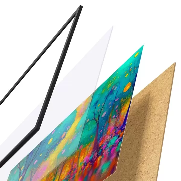 El póster consta de marco, plexiglás, imagen impresa y soporte de aglomerado. El póster puede colgarse inmediatamente en la pared gracias a los soportes de la parte posterior.