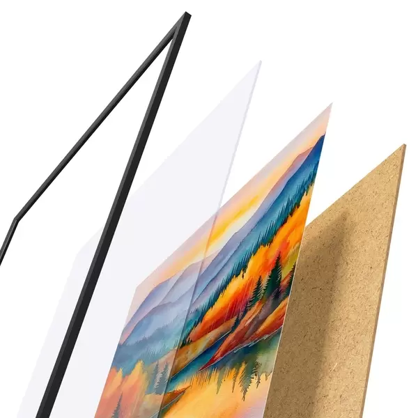 El póster consta de marco, plexiglás, imagen impresa y soporte de aglomerado. El póster puede colgarse inmediatamente en la pared gracias a los soportes de la parte posterior.