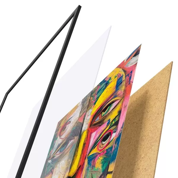 El póster consta de marco, plexiglás, imagen impresa y soporte de aglomerado. El póster puede colgarse inmediatamente en la pared gracias a los soportes de la parte posterior.