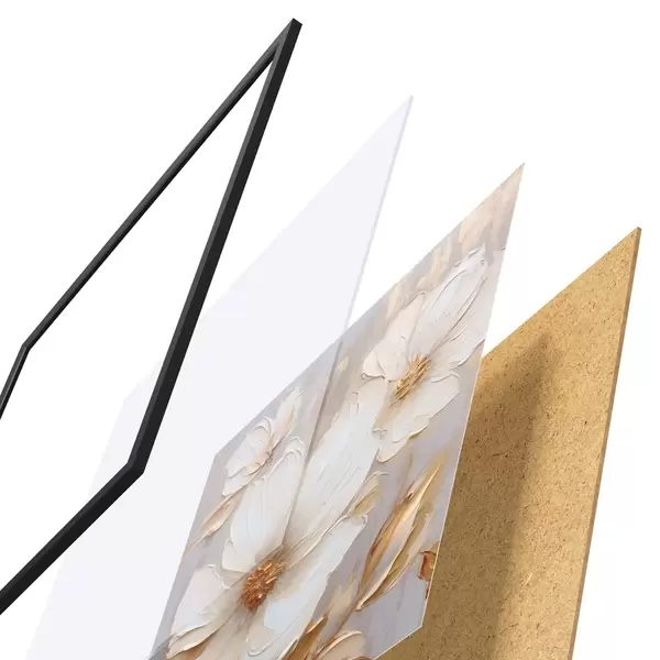 El póster consta de marco, plexiglás, imagen impresa y soporte de aglomerado. El póster puede colgarse inmediatamente en la pared gracias a los soportes de la parte posterior.