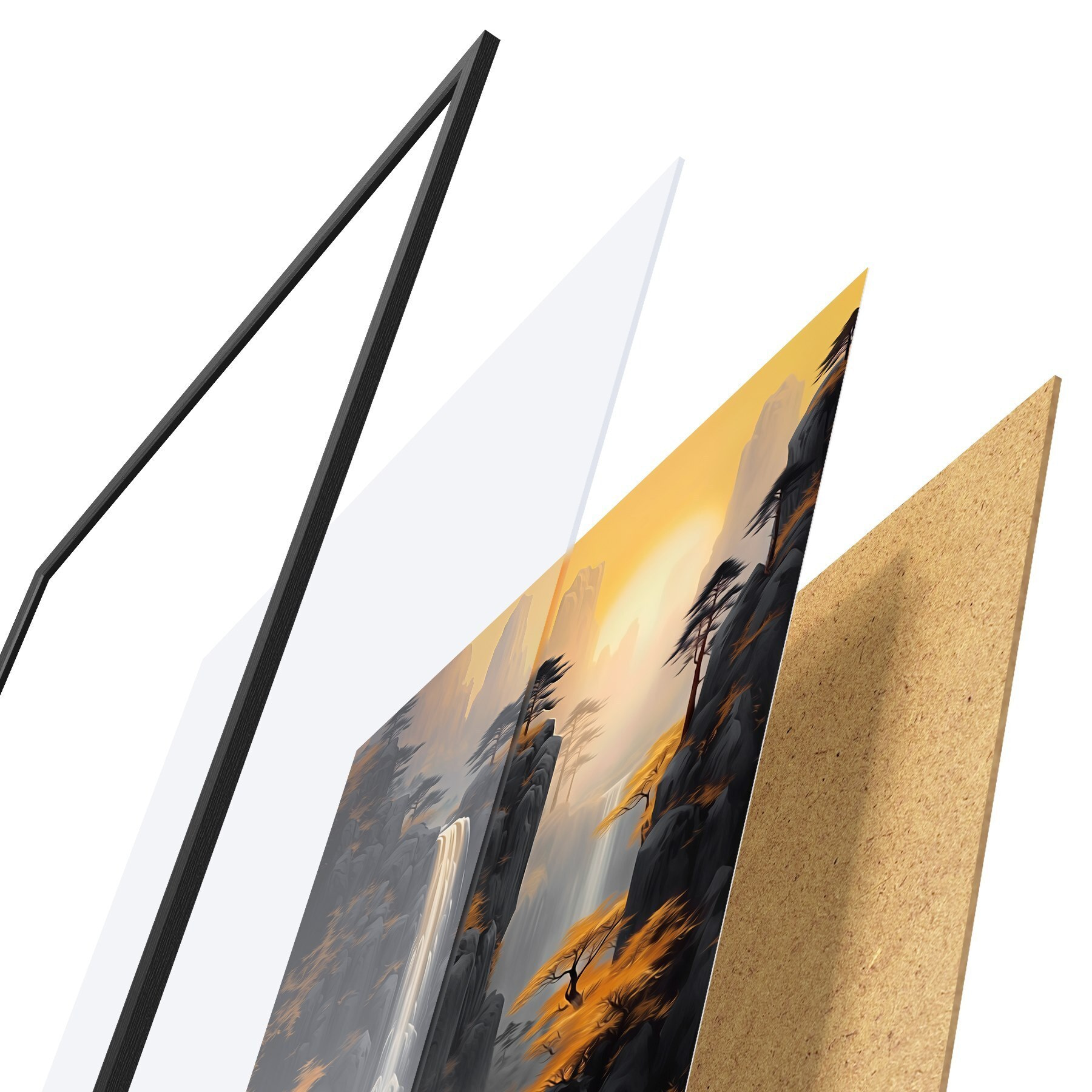 Poster Paisaje rocoso con una cascada en cálidos tonos del atardecer f46177