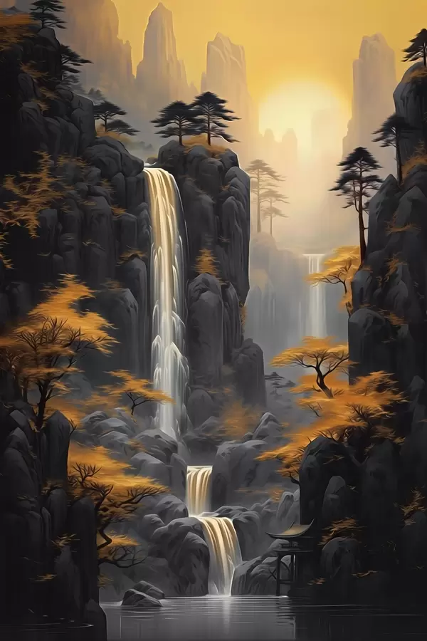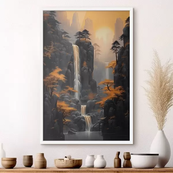 Poster Paisaje rocoso con una cascada en cálidos tonos del atardecer Nr f46177