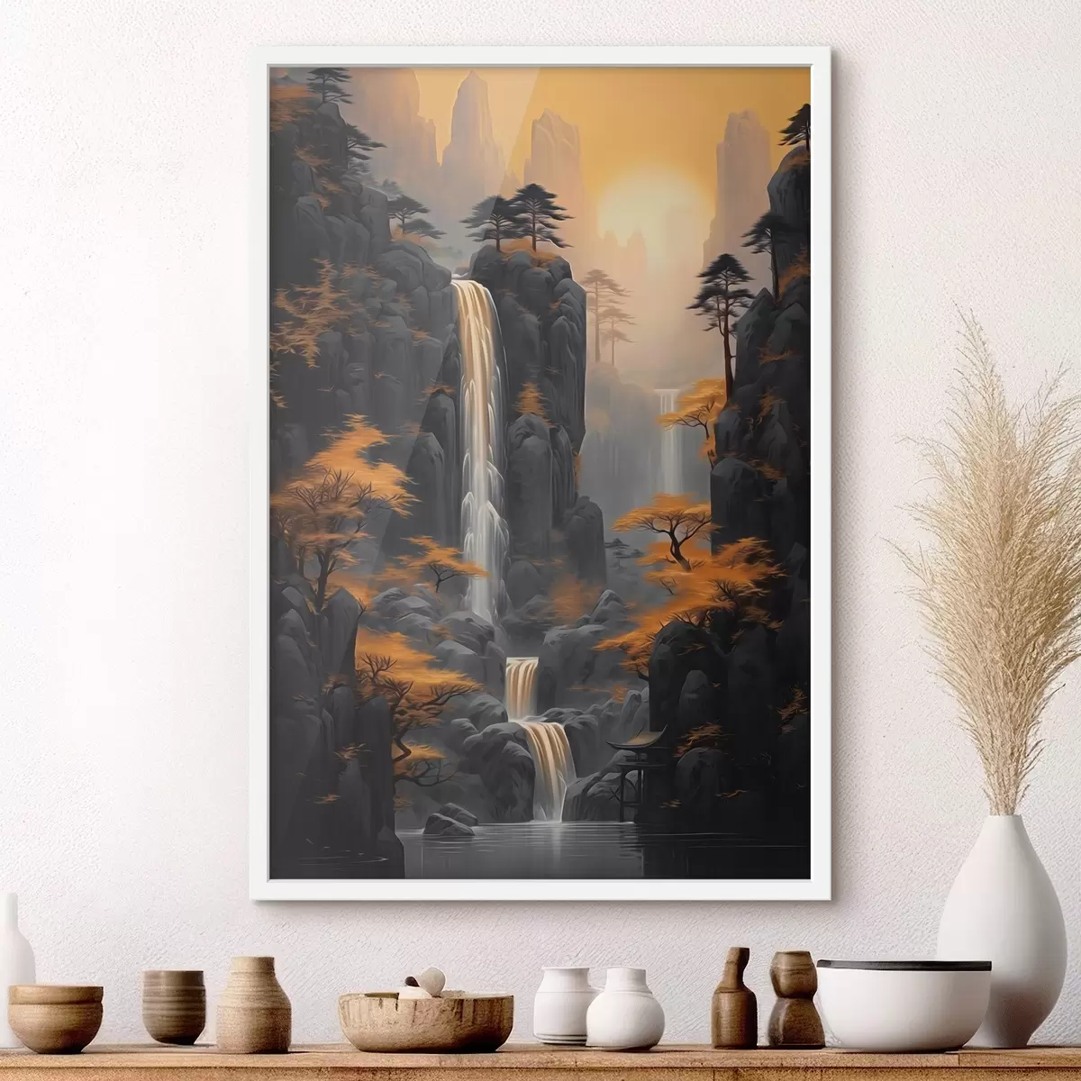 Poster Paisaje rocoso con una cascada en cálidos tonos del atardecer f46177