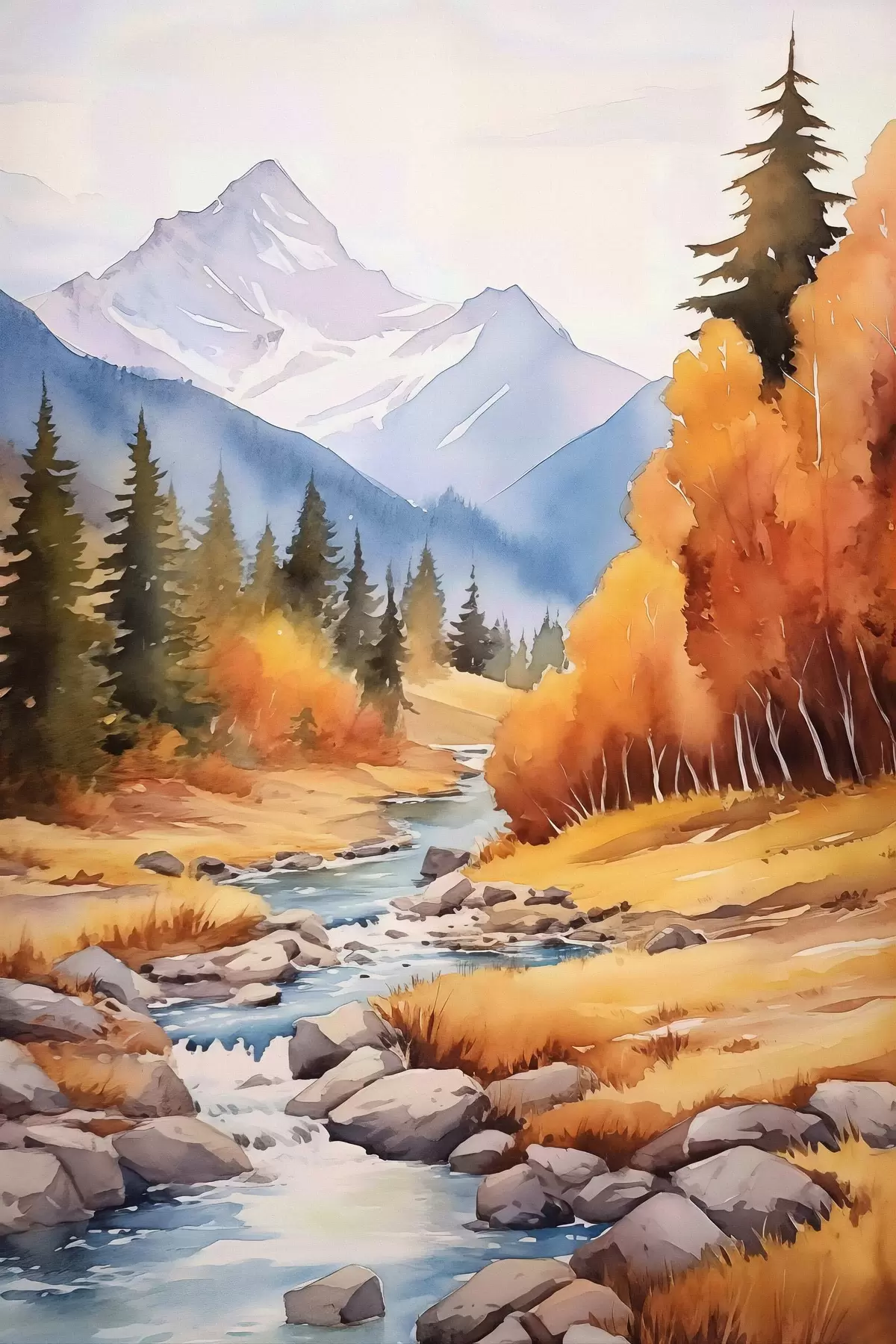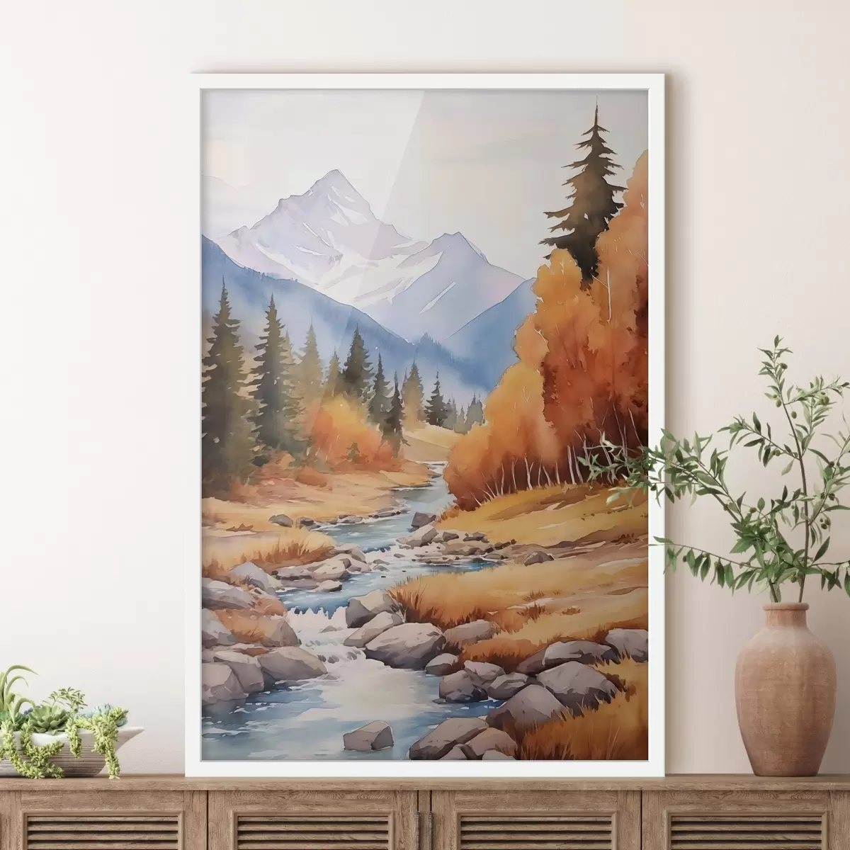 Poster Paisaje montañoso otoñal con un río y un bosque lleno de vida Nr f46187