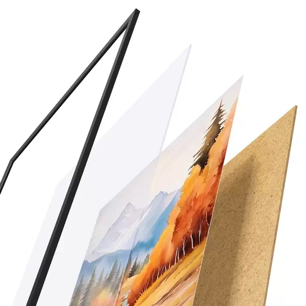 El póster consta de marco, plexiglás, imagen impresa y soporte de aglomerado. El póster puede colgarse inmediatamente en la pared gracias a los soportes de la parte posterior.