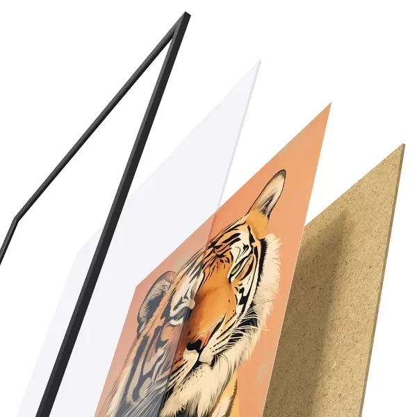 El póster consta de marco, plexiglás, imagen impresa y soporte de aglomerado. El póster puede colgarse inmediatamente en la pared gracias a los soportes de la parte posterior.