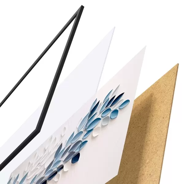 El póster consta de marco, plexiglás, imagen impresa y soporte de aglomerado. El póster puede colgarse inmediatamente en la pared gracias a los soportes de la parte posterior.