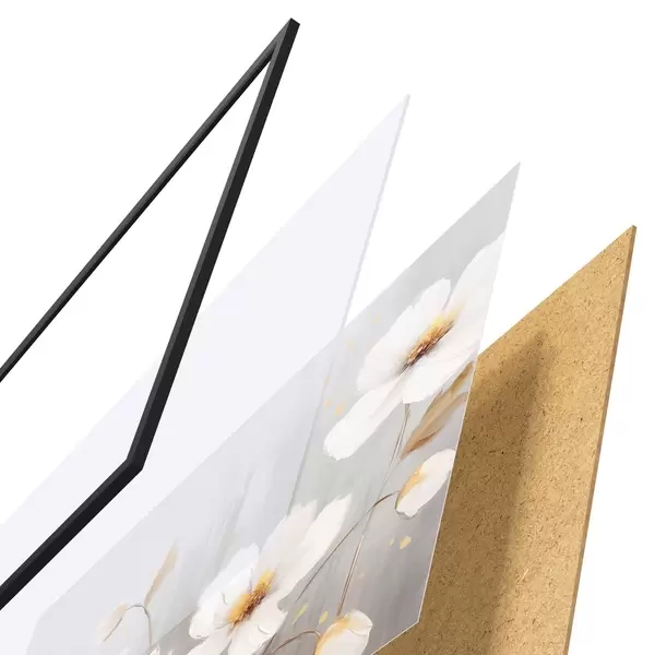 El póster consta de marco, plexiglás, imagen impresa y soporte de aglomerado. El póster puede colgarse inmediatamente en la pared gracias a los soportes de la parte posterior.