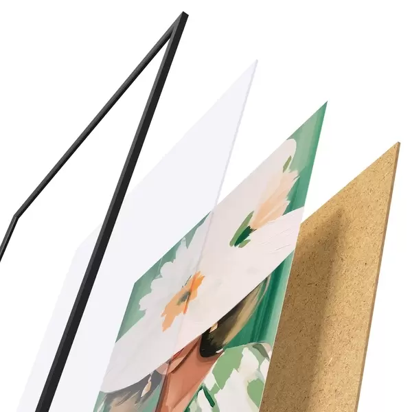 El póster consta de marco, plexiglás, imagen impresa y soporte de aglomerado. El póster puede colgarse inmediatamente en la pared gracias a los soportes de la parte posterior.