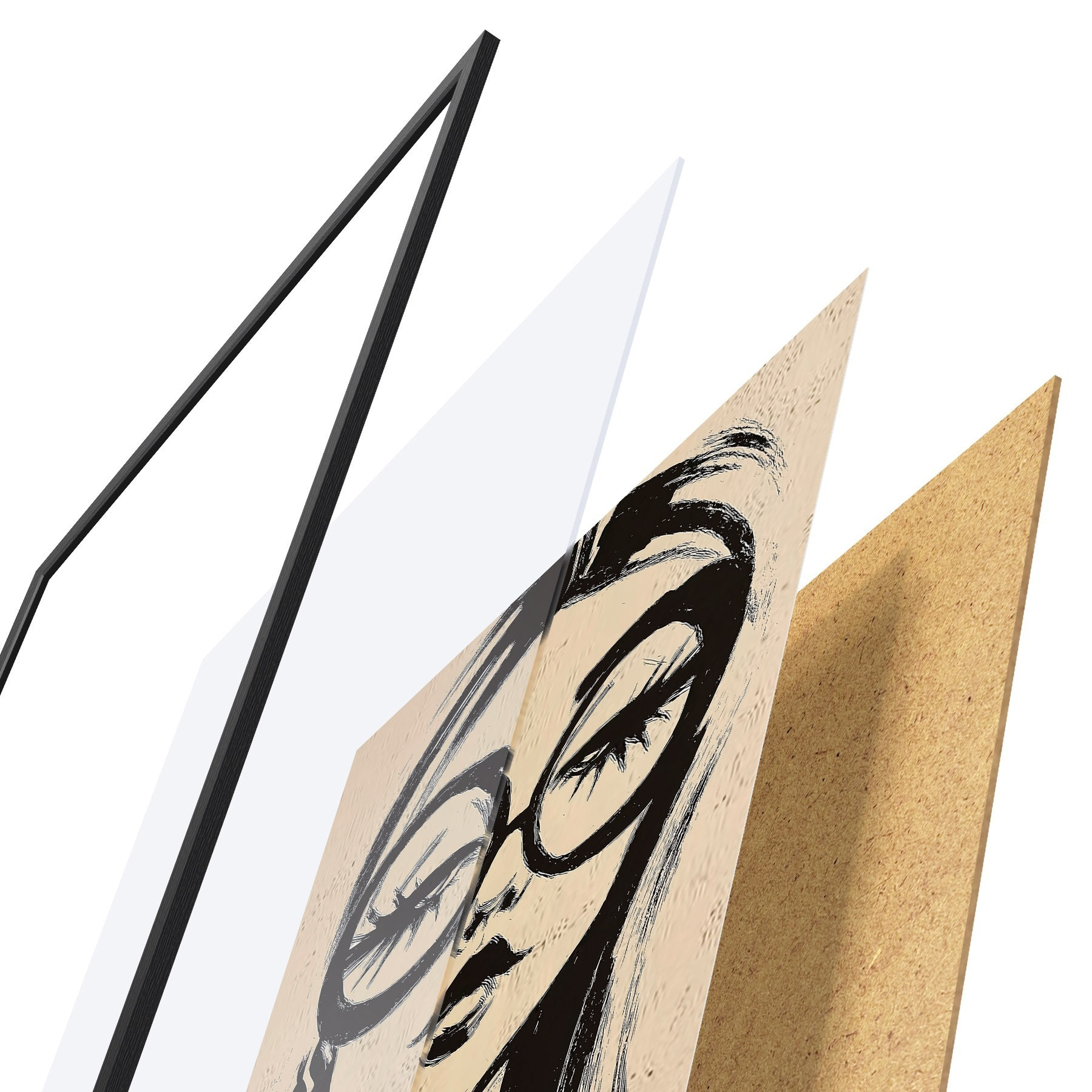 El póster consta de marco, plexiglás, imagen impresa y soporte de aglomerado. El póster puede colgarse inmediatamente en la pared gracias a los soportes de la parte posterior.