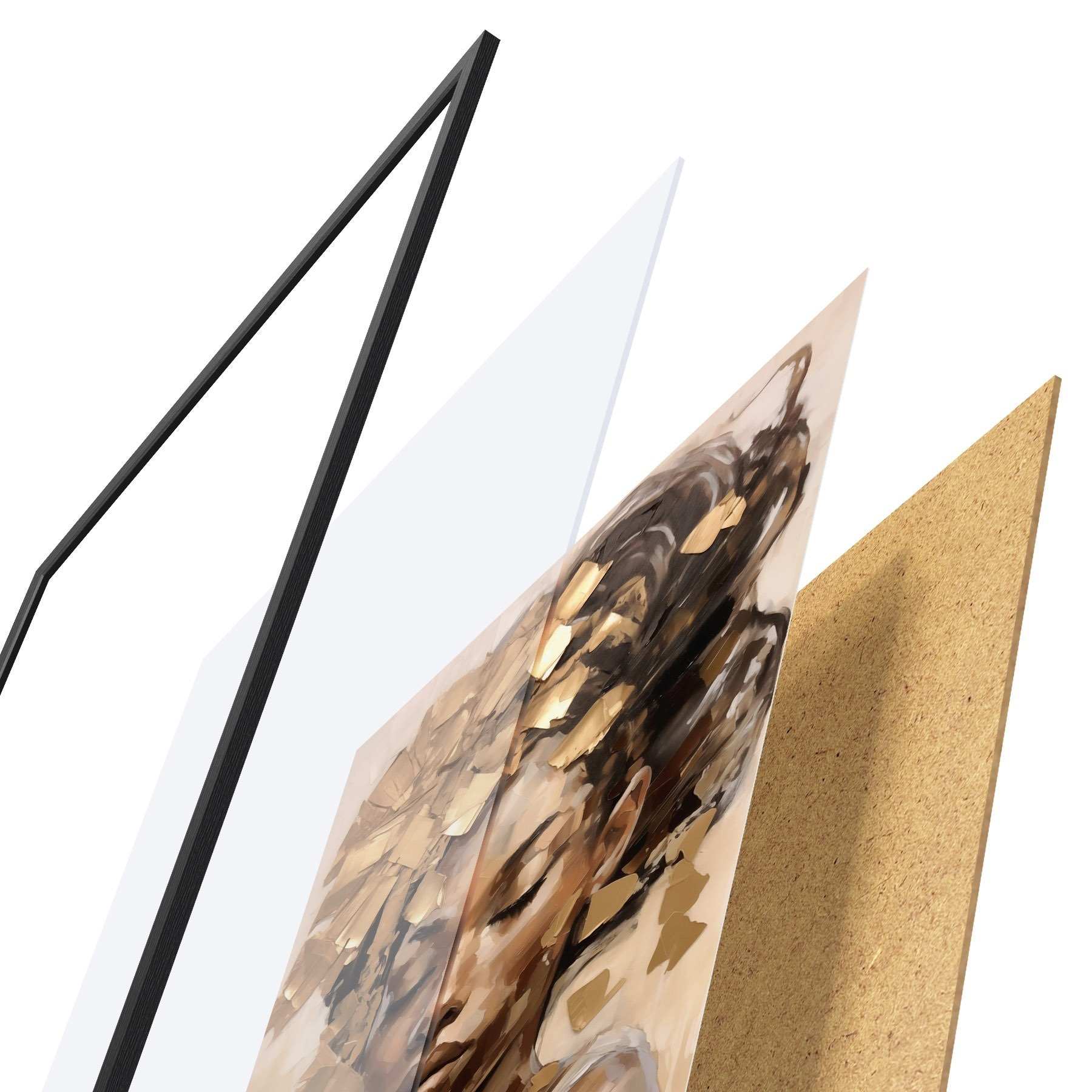El póster consta de marco, plexiglás, imagen impresa y soporte de aglomerado. El póster puede colgarse inmediatamente en la pared gracias a los soportes de la parte posterior.
