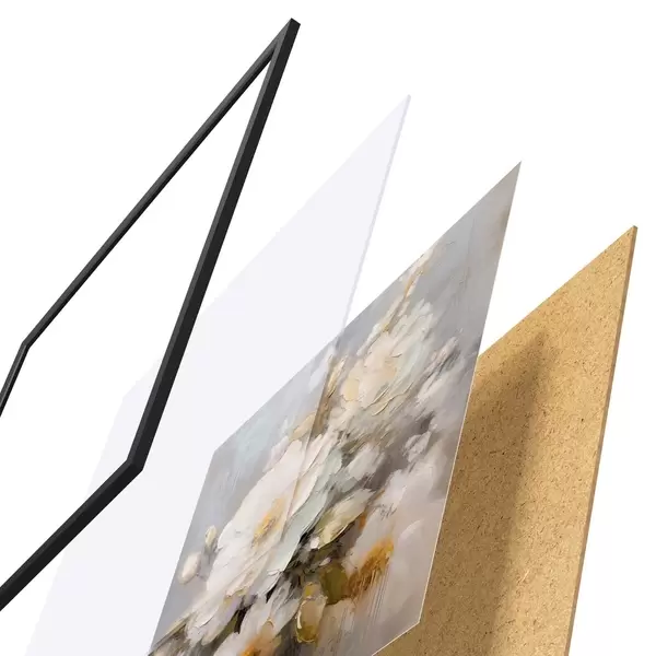 El póster consta de marco, plexiglás, imagen impresa y soporte de aglomerado. El póster puede colgarse inmediatamente en la pared gracias a los soportes de la parte posterior.
