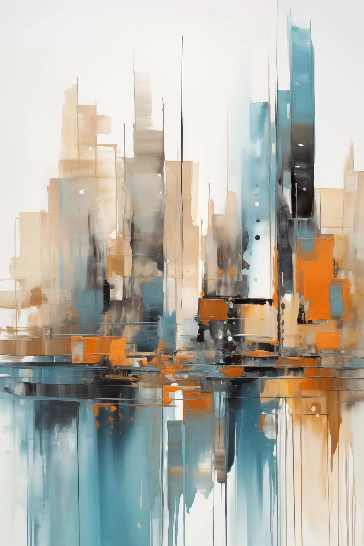 Poster Paisaje urbano abstracto con pinceladas verticales en naranja, verde azulado y marrón, y formas geométricas Nr f46266