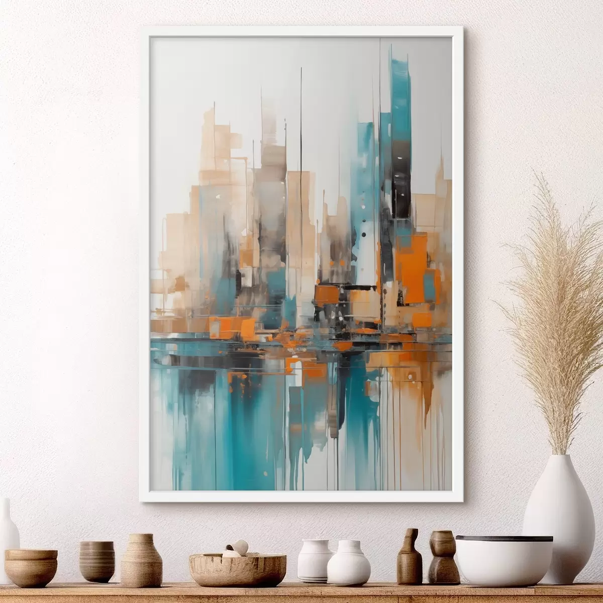 Poster Paisaje urbano abstracto con pinceladas verticales en naranja, verde azulado y marrón, y formas geométricas f46266