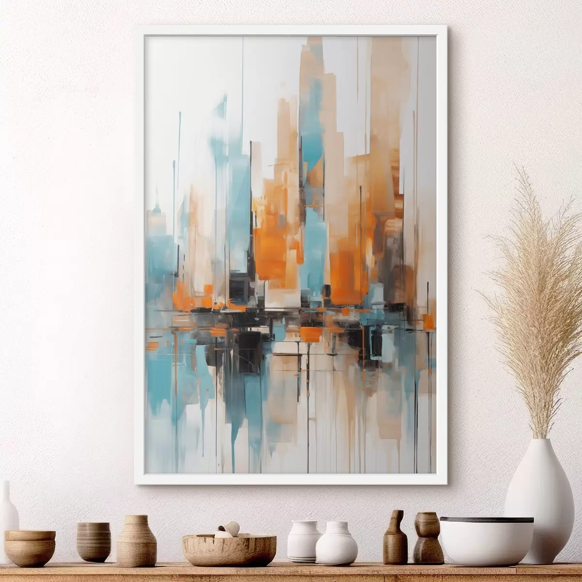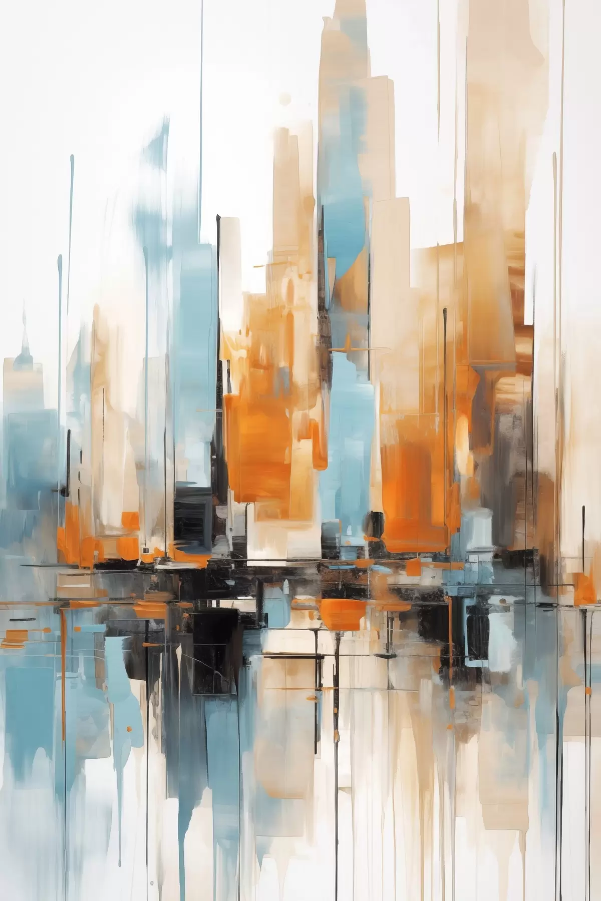 Poster Paisaje urbano abstracto con pinceladas verticales en tonos naranjas, azules y blancos, estilo pictórico Nr f46267