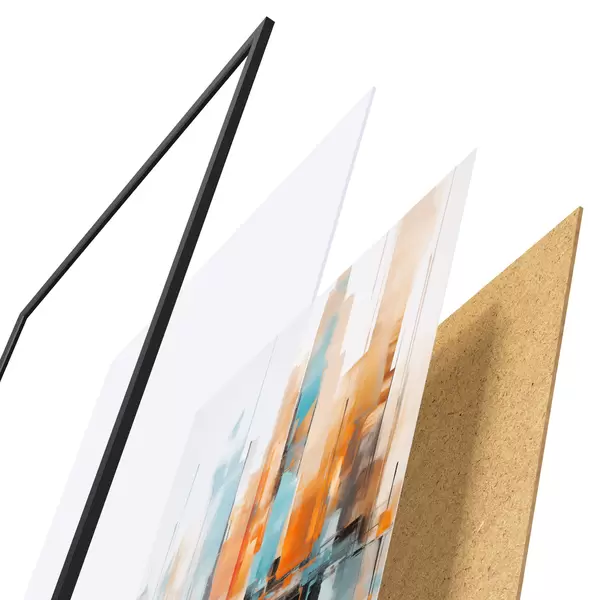 El póster consta de marco, plexiglás, imagen impresa y soporte de aglomerado. El póster puede colgarse inmediatamente en la pared gracias a los soportes de la parte posterior.