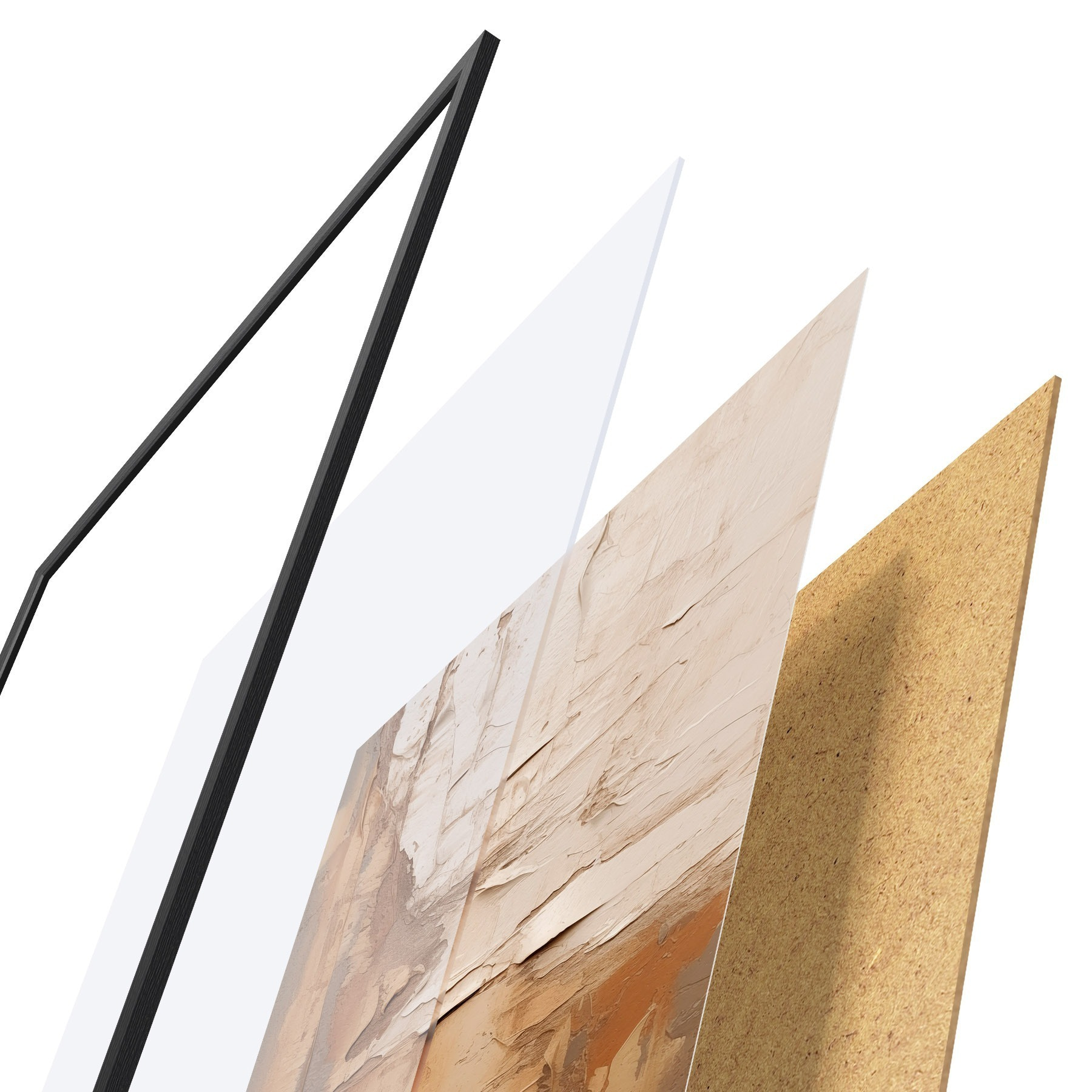 El póster consta de marco, plexiglás, imagen impresa y soporte de aglomerado. El póster puede colgarse inmediatamente en la pared gracias a los soportes de la parte posterior.