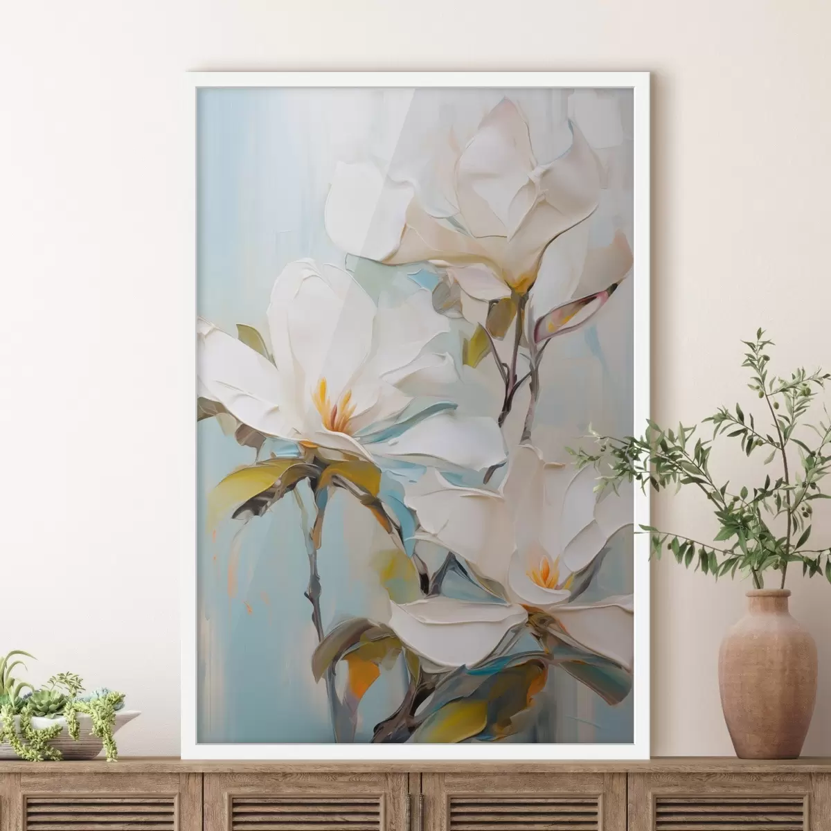 Poster Flores blancas de magnolia, fondo azul claro con suaves pinceladas, estilo pintura al óleo, textura impasto f46276