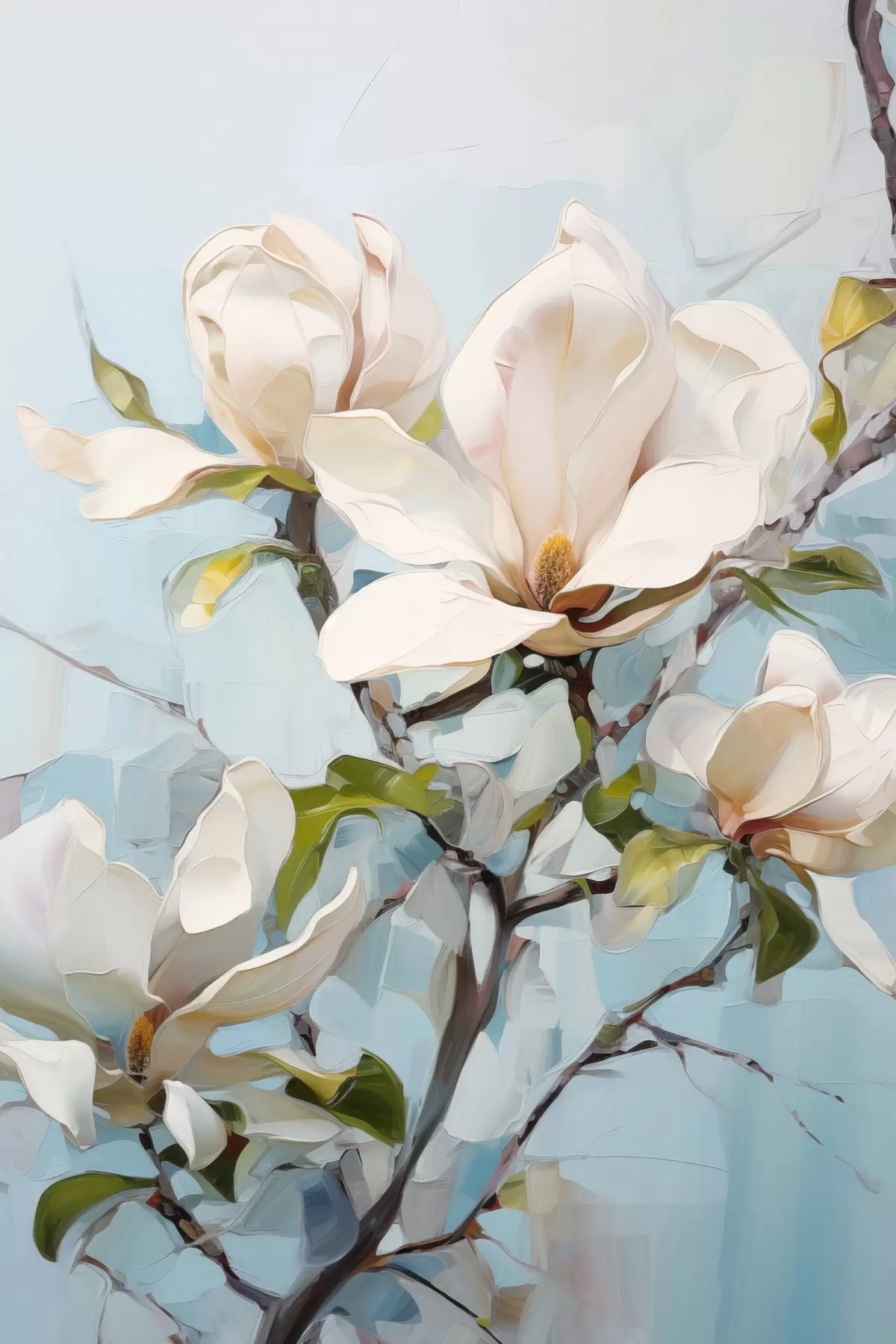 Poster Flores blancas de magnolia, fondo azul claro con suaves pinceladas, estilo pintura al óleo, textura impasto Nr f46277