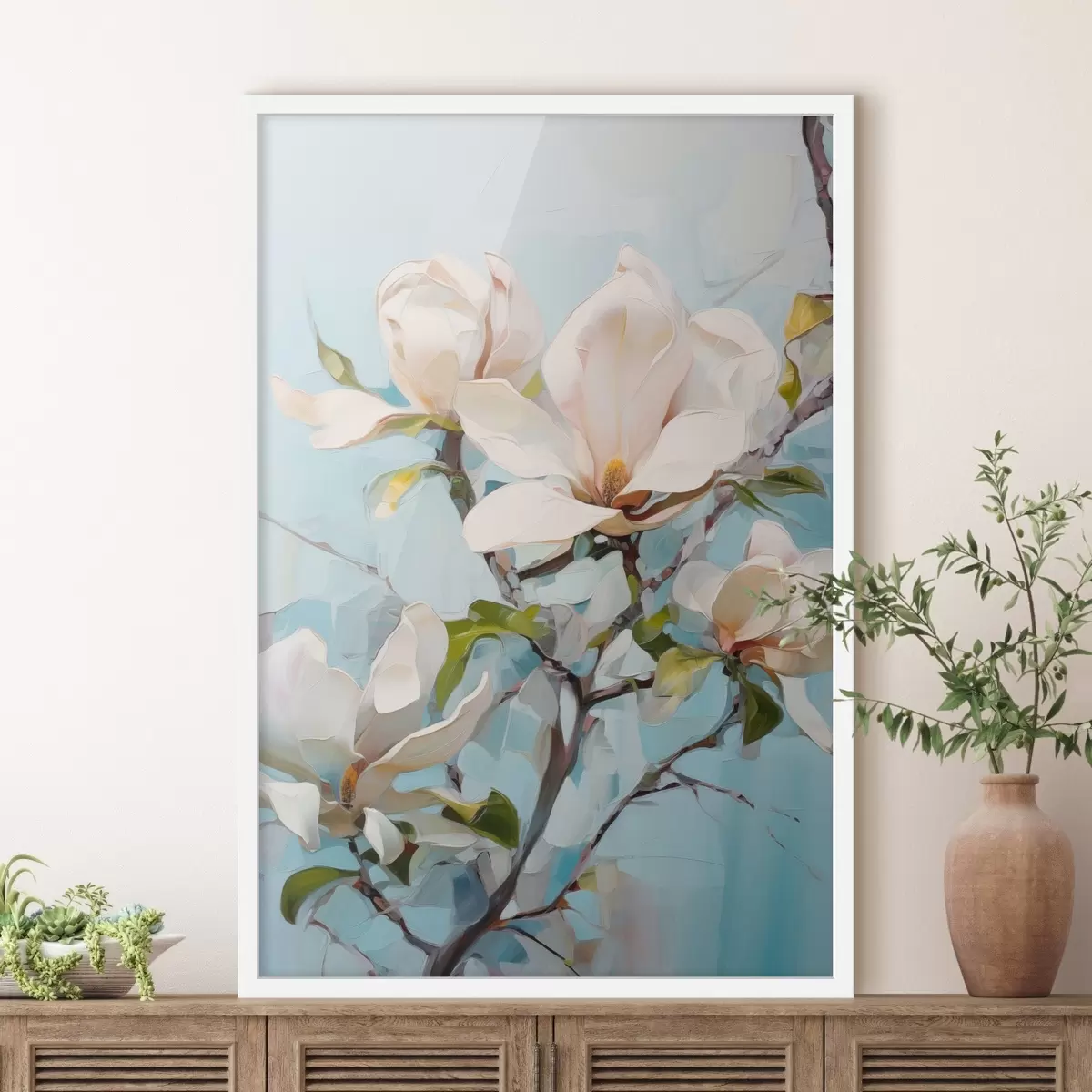Poster Flores blancas de magnolia, fondo azul claro con suaves pinceladas, estilo pintura al óleo, textura impasto f46277