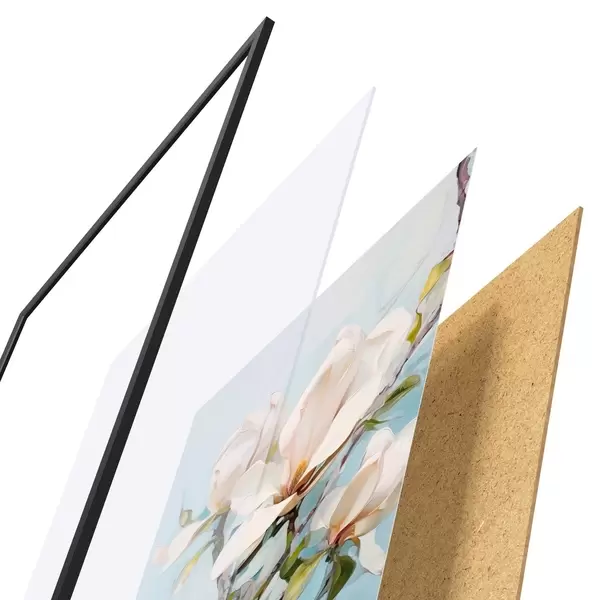 El póster consta de marco, plexiglás, imagen impresa y soporte de aglomerado. El póster puede colgarse inmediatamente en la pared gracias a los soportes de la parte posterior.