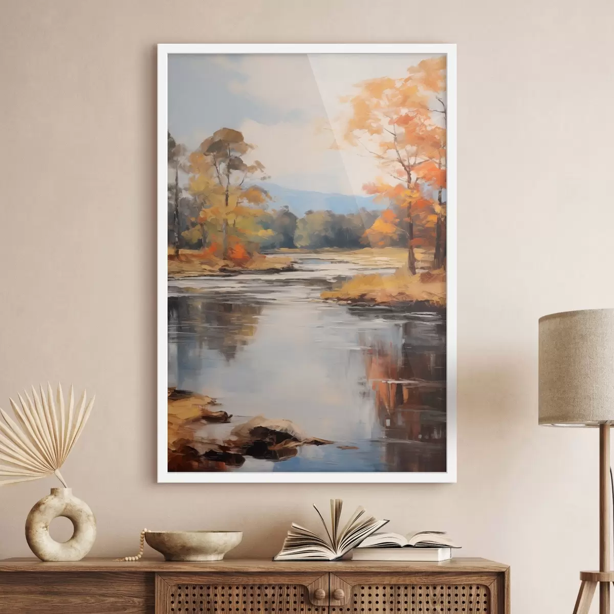 Poster Paisaje con un río que fluye a través de un bosque en otoño, árboles amarillos y naranjas, estilo pictórico Nr f46281