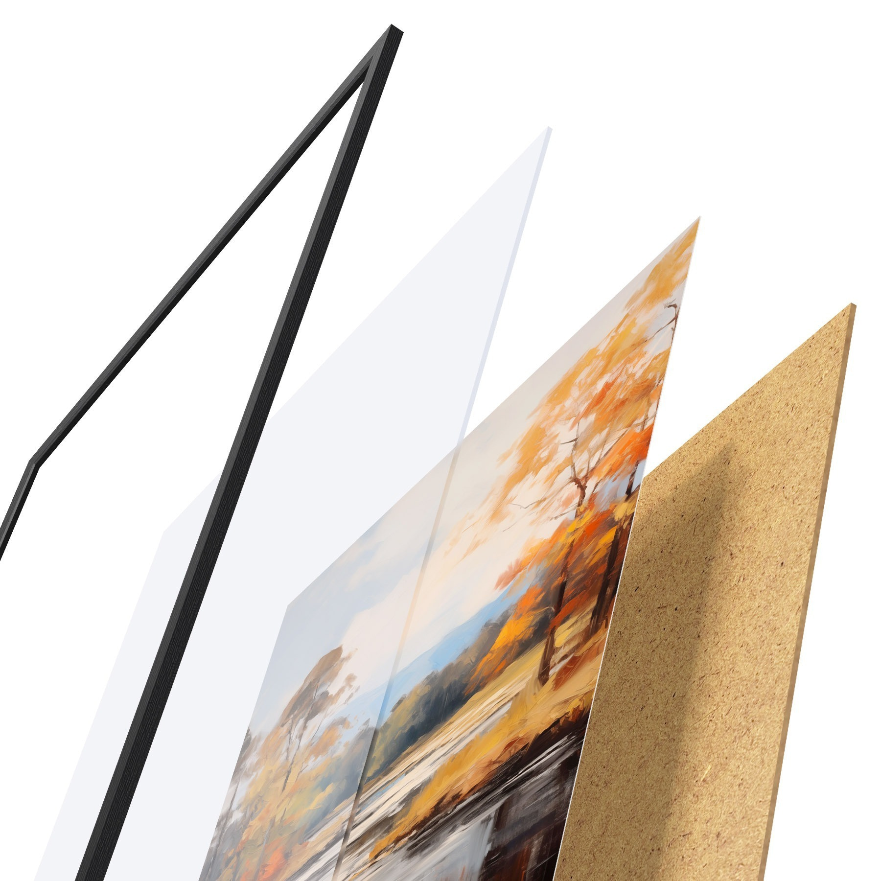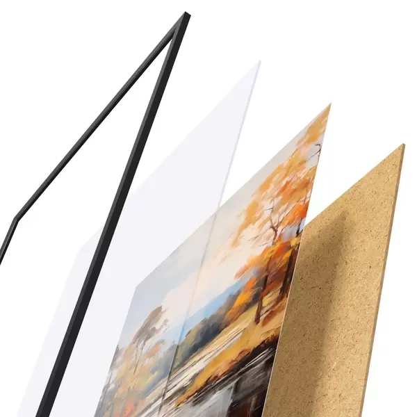 El póster consta de marco, plexiglás, imagen impresa y soporte de aglomerado. El póster puede colgarse inmediatamente en la pared gracias a los soportes de la parte posterior.
