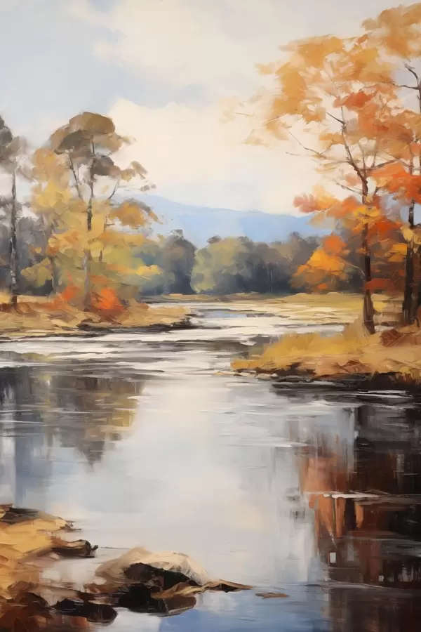 Poster Paisaje con un río que fluye a través de un bosque en otoño, árboles amarillos y naranjas, estilo pictórico Nr f46281