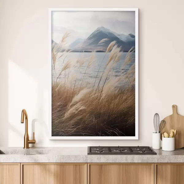 Poster Hierba de la pampa con un lago y montañas al fondo, iluminación suave, colores apagados, estilo naturalista f46283
