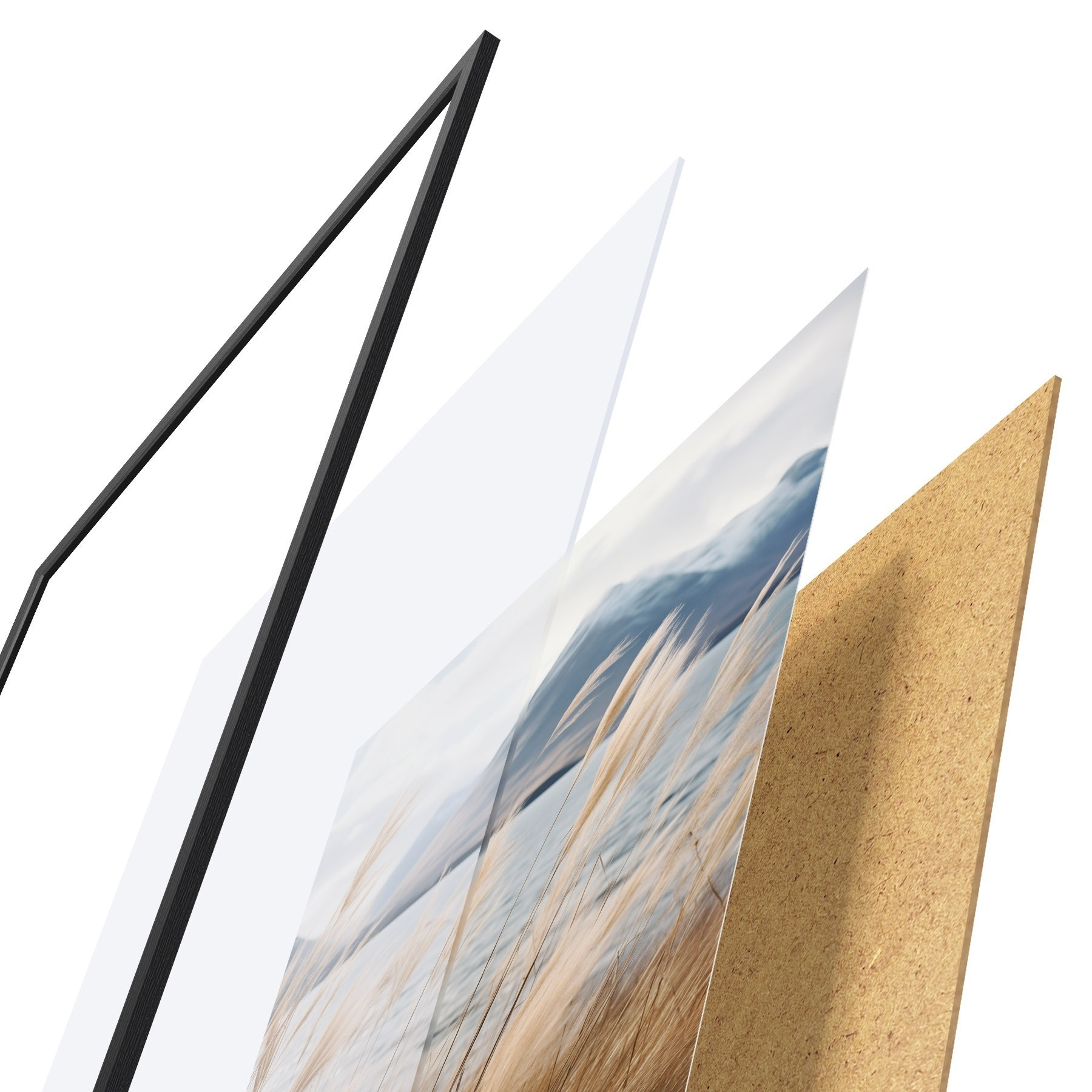 El póster consta de marco, plexiglás, imagen impresa y soporte de aglomerado. El póster puede colgarse inmediatamente en la pared gracias a los soportes de la parte posterior.
