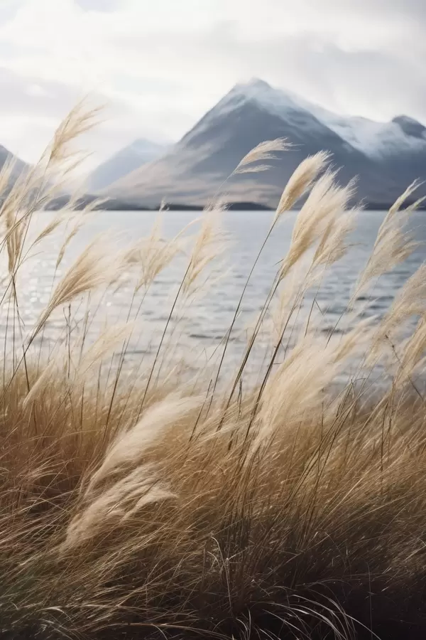Poster Hierba de la pampa con un lago y montañas al fondo, iluminación suave, colores apagados, estilo naturalista Nr f46283